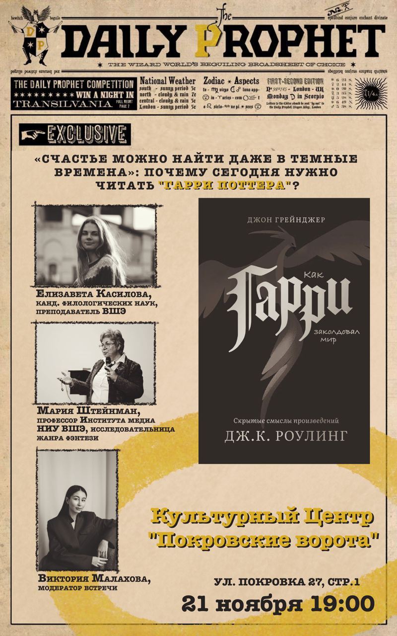 История о юном волшебнике — не просто очередная фентези книга для подростков. Это увлекательный диалог с читателем, почти духовная литература, в которой автор через яркие образы и загадочные символы пытается донести до читателей важные смыслы.   |      |     |           Издание исследования Дж. Грейнджер  "Как Гарри заколдовал мир" (Никея, 2023г) хороший повод вернуться к разговору об истории, которая каким-то образом помогает жить в настоящем, даже в таком непростом, темном настоящем. Почему же сегодня можно и нужно читать " Гарри Поттера"? Ответить на этот вопрос мы пригласили наших гостей: -  Елизавета Касилова – кандидат филологических наук, ВШЭ, специалист по произведениям Дж. Роулинг. -  Мария Штейнман – профессор ВШЭ, исследовательница жанра фэнтези. -  Виктория Малахова - журналист, автор телеграм-канала "Виток" и подкаста "Содержание".    |      |     |          |   Презентация альманаха  «Слово и камень» — нового издания о сакральной архитектуре и искусстве