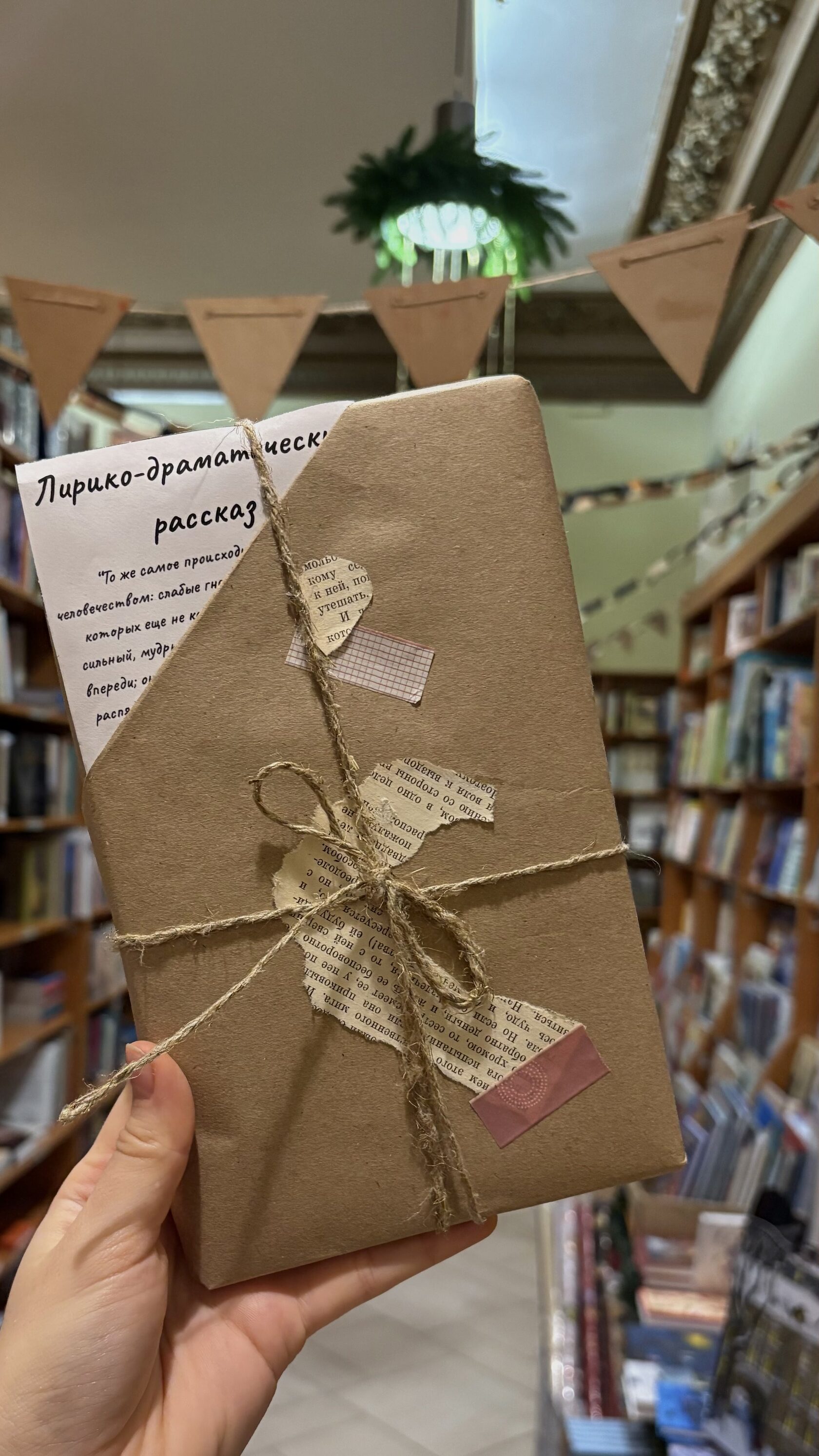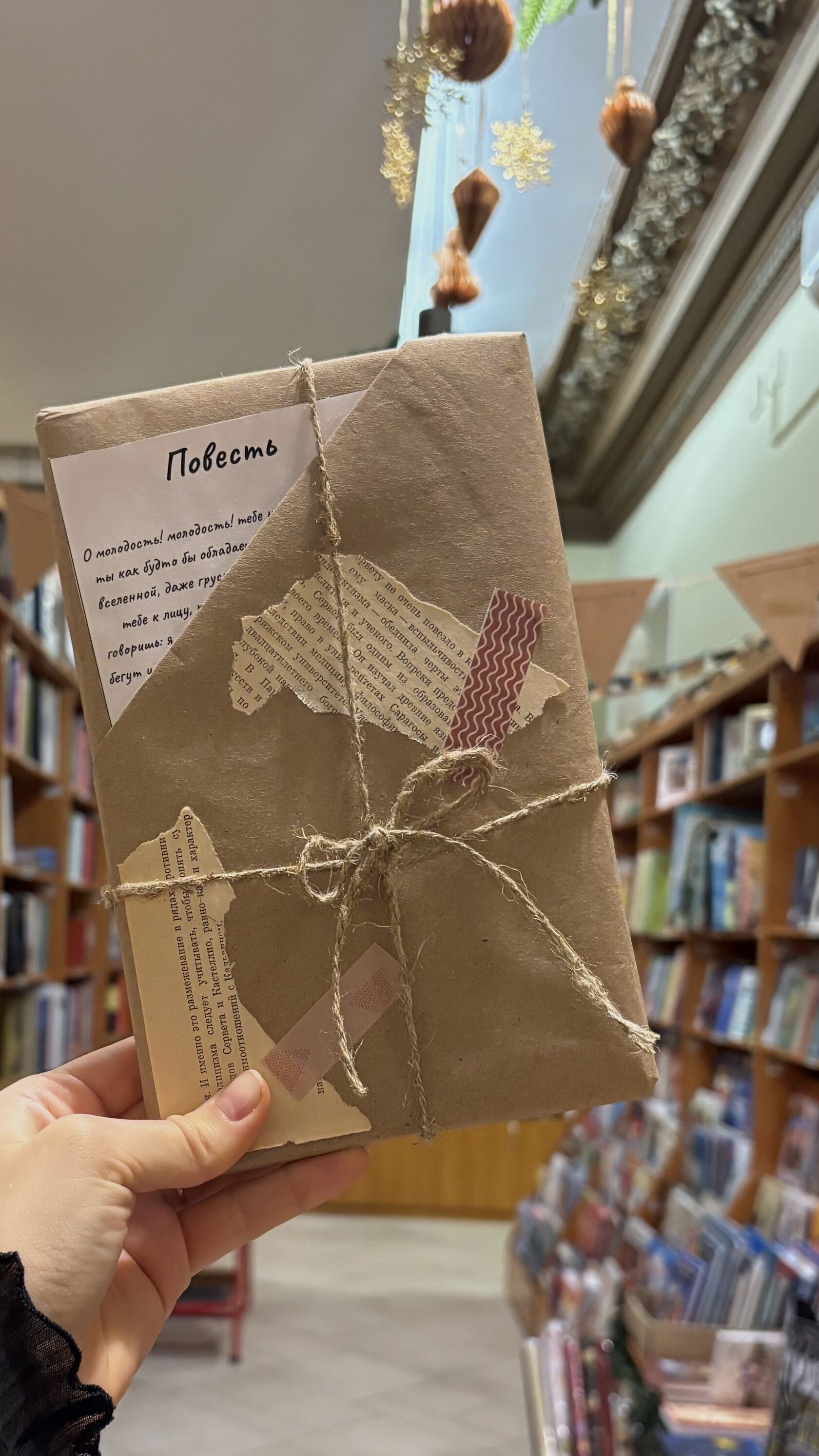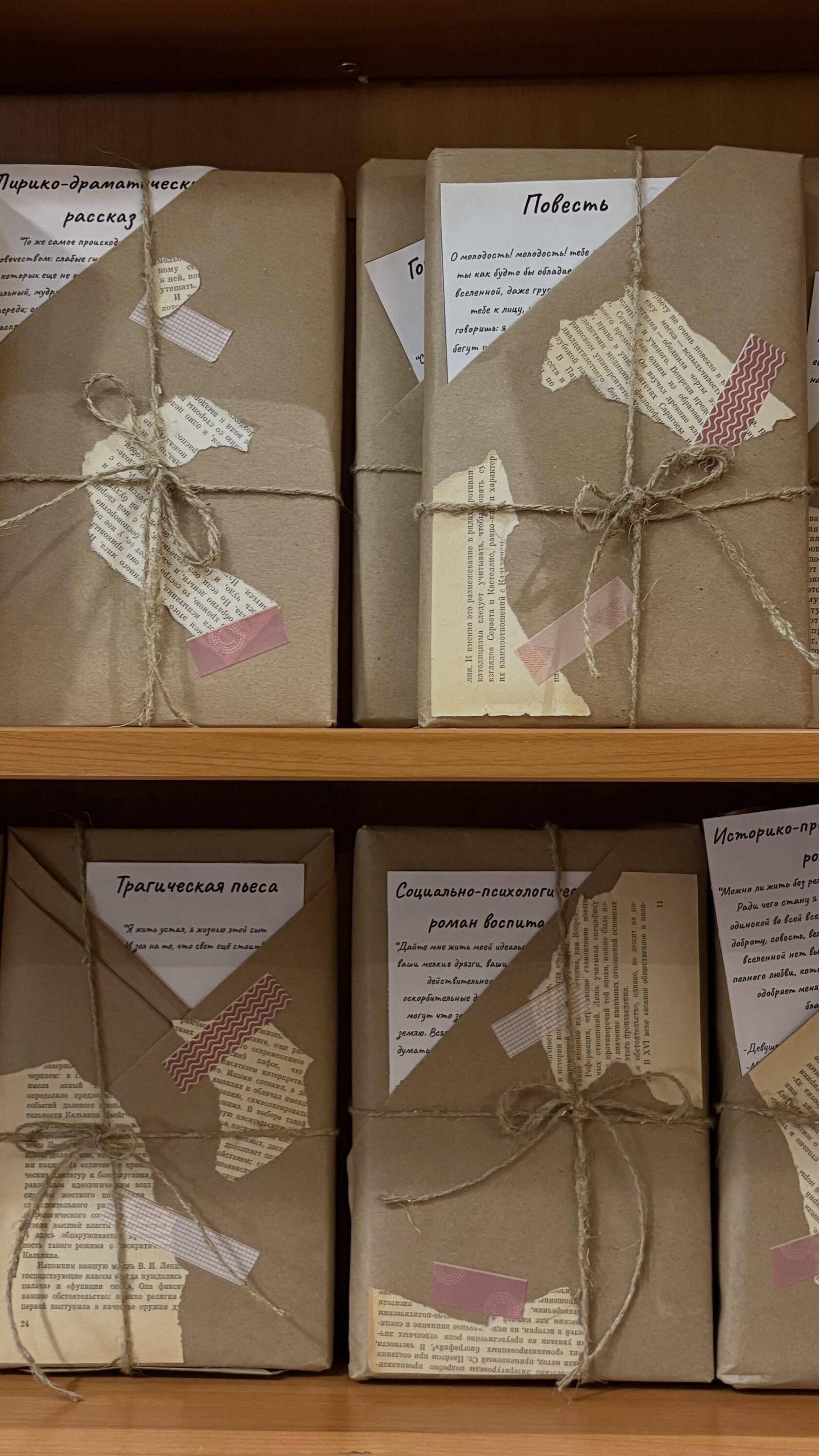 - Эстетичная ручная упаковка: крафт‑бумага, шпагат, декоративные вырезки из книг — подарки сразу готовы к вручению