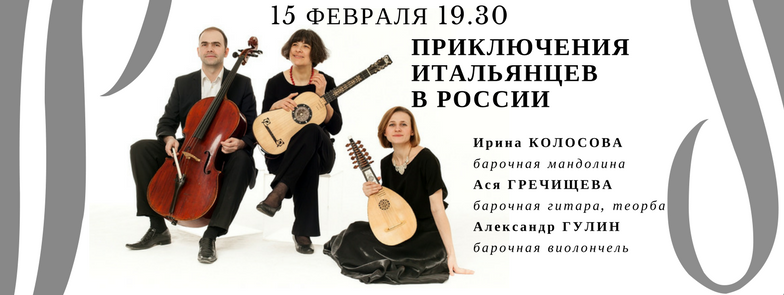 |   "Приключения итальянцев в России"   |      |     |          |   Ирина КОЛОСОВА барочная мандолина Ася ГРЕЧИЩЕВА барочная гитара, теорба Александр ГУЛИН барочная виолончель   |      |     |          |   В программе произведения итальянских композиторов XVII-XVIII вв.:  Д. Скарлатти, К. Арригони, А. Вивальди, Ф. Рицци. Х. Синьорелли.   |      |     |          |    |     |   Льготный билет   |     |   Студенты, пенсионеры и дети до 11 лет.   |     |   300 р.     |       |      |     |          |   Справки и бронирование билетов по телефону +7 495 223 58 10 e-mail: pokrovka_27@mail.ru   |      |     |      |