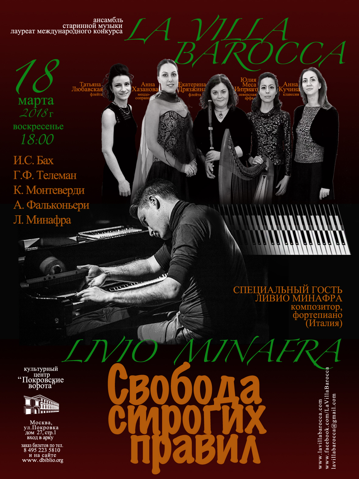 | | | | | | | | И, конечно же, музыка ♫ ♪ Бронирование билетов по телефону +7 495 223 58 10 | | | | Программа «Свобода строгих правил», подготовленная ансамблем старинной музыки «La Villa Barocca» совместно с итальянским джазовым пианистом Ливио Минафра, – это гармоничное переплетение двух стилей: барокко и джаза.